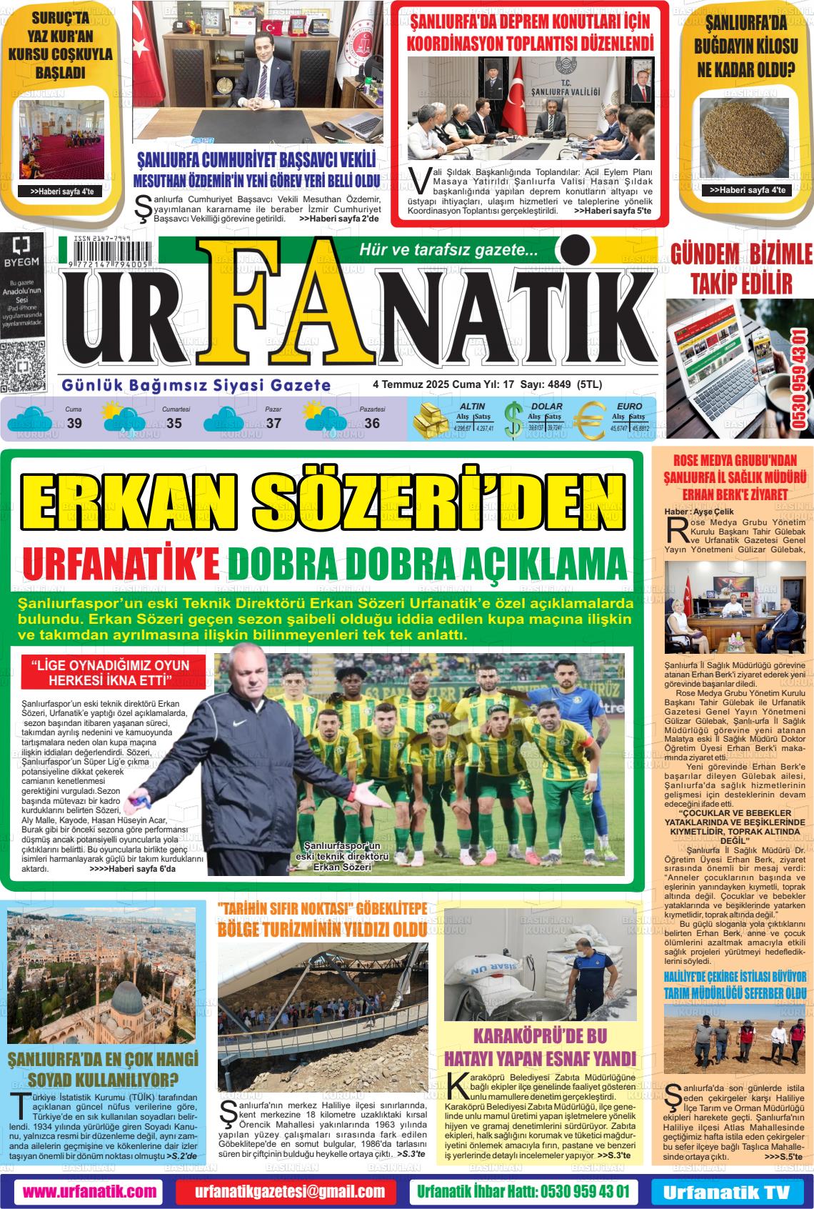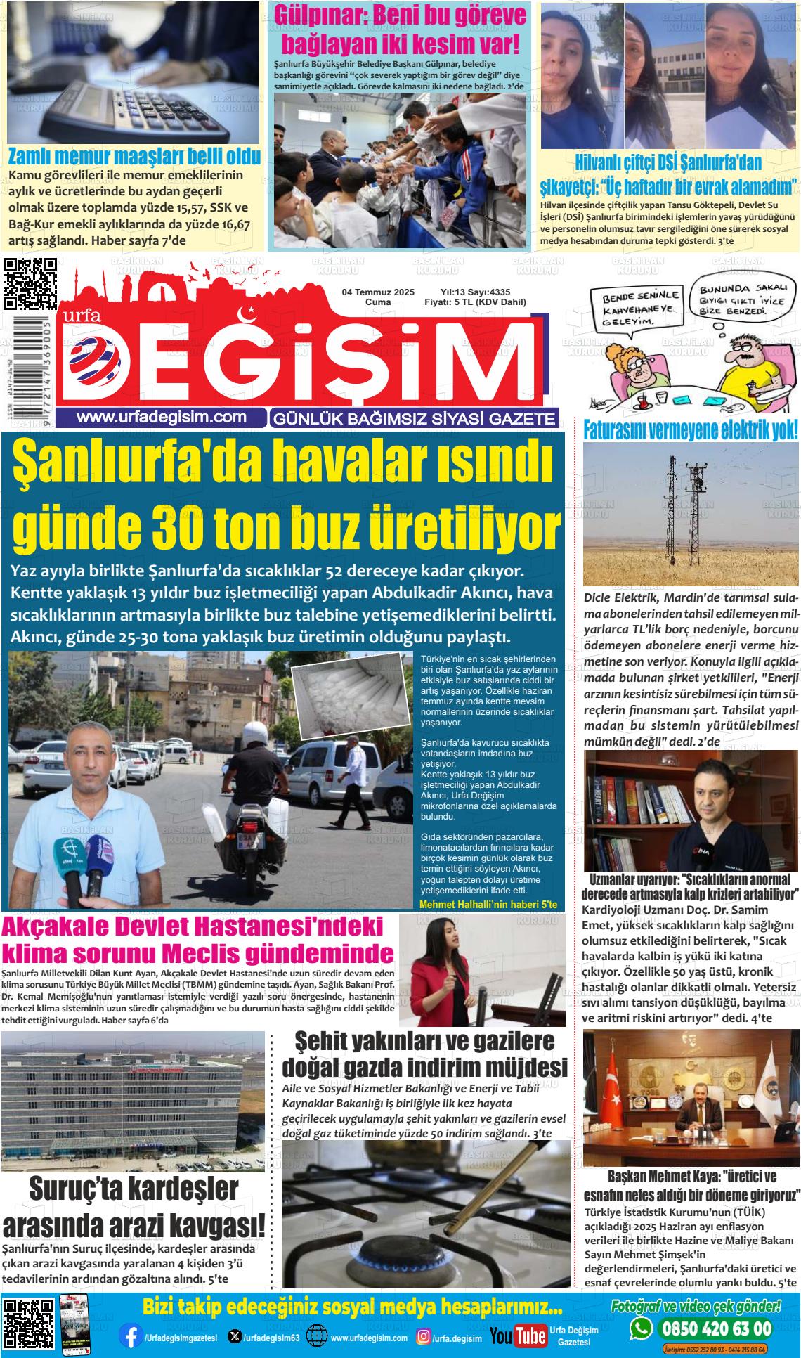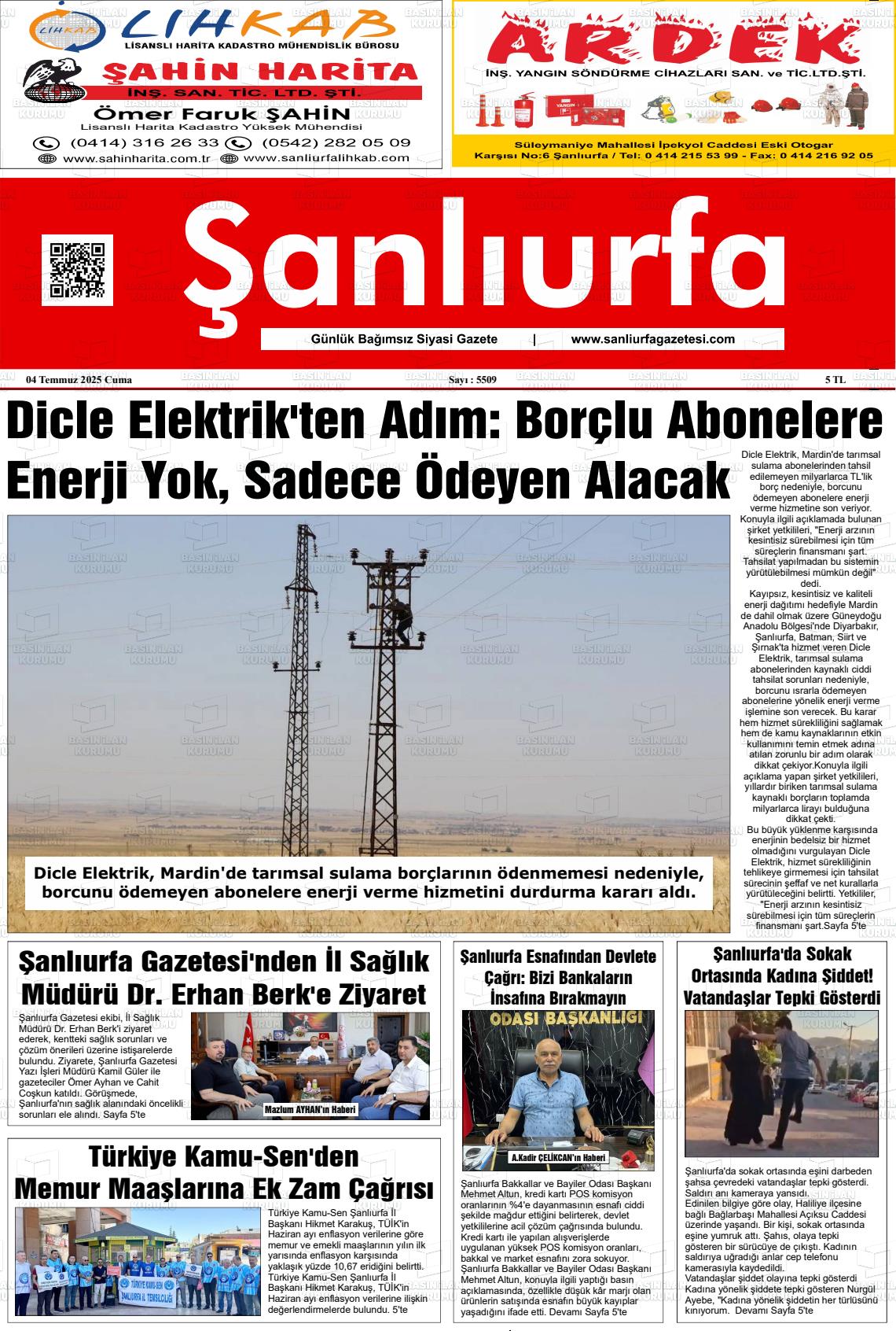 Şanlıurfa Yerel Gazeteleri 09 Mart 2026, Pazartesi Günü Manşeti