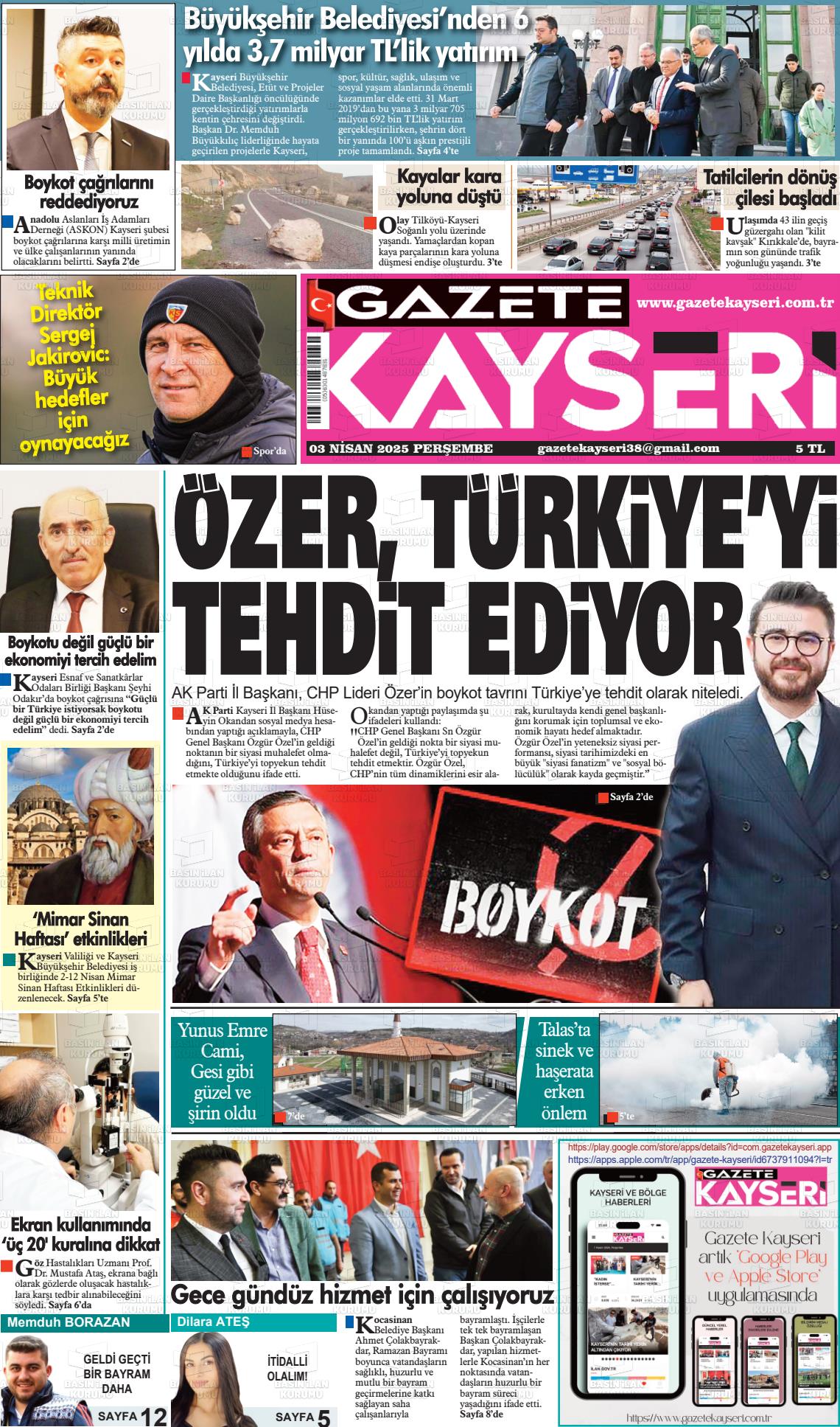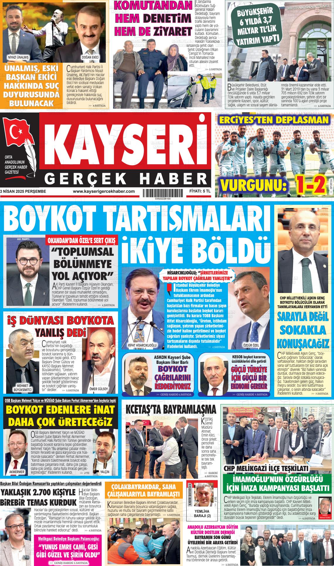 Kayserİ Yerel Gazeteleri 09 Mart 2026, Pazartesi Günü Manşeti